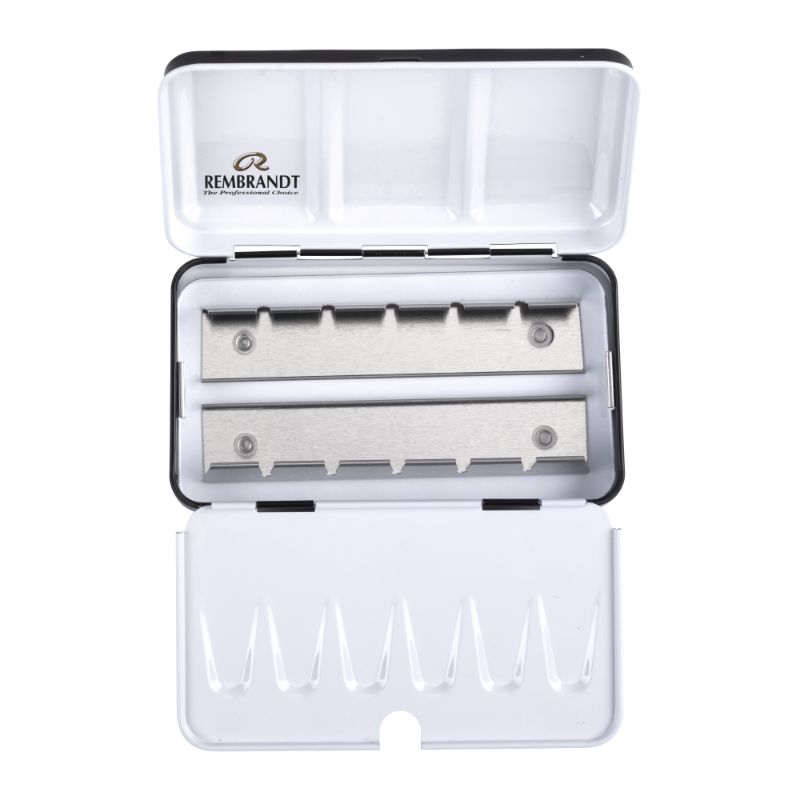 Estuche metálico prémium diseñado con capacidad para 12 medias pastillas de acuarela Rembrandt. Suficientemente resistente para un transporte fácil. Las tapas metálicas tienen bisagras y se pueden usar como recipientes para mezclar. Las medias pastillas de pintura se venden por separado.